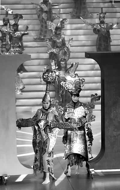 时针指向18日20点05分,在宁波体育中心体育馆,令人关注的“霓裳海”终于到来。在500名纤夫的牵引下,古代巨舰“神舟号”入海,划出了一条壮阔的海上丝绸之路,东南亚的服饰、金字塔式的服饰、比萨斜塔式的服饰,令人眼花缭乱,“神舟”所到之处,得到了世界各国人民的礼遇……