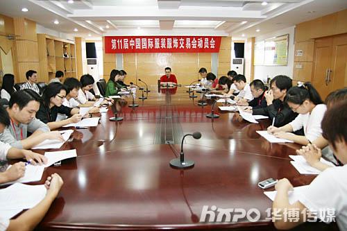(通讯员应春娇)9月22日,是第十一届中国国际服装服饰交易会倒记时一个月的特殊日子,服交会执行承办单位宁波华博会议展览有限公司召开动员大会。会议由华博联合总经理助理范文彧主持,华博联合董事长、服交会组委会副秘书长杨杰作动员讲话,华博联合全体员工参加会议,并就组委会下发的本届服交会操作手册和迎接服交会开展的工作提出了意见和建议。