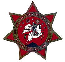 国徽:在一枚七角星内套着一个圆,圆面上一匹白色骏马飞奔在山峰之上,马上的骑士是英雄吉特里格奥尔基,他身穿铠甲,手持长矛和圆盾,白色披巾随风飘扬。骑士的上面有五枚小八角星,其间镶有太阳和月亮。
