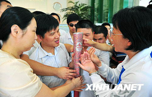 9月1日,北京残奥会火炬接力运行团队的工作人员吕晓红(右)向南京市残疾人中医康复服务中心的盲人医生介绍北京残奥会火炬。 当日,北京残奥会火炬接力运行团队的工作人员将残奥会火炬带到南京市残疾人中医康复服务中心、南京方舟启智中心等处,让残障人士亲密接触残奥会火炬,喜迎圣火的到来。9月2日,北京残奥会圣火将在南京传递。 新华社记者张善臣摄