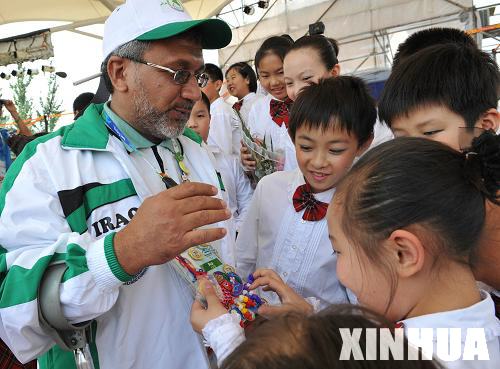 9月4日,合唱团小演员在北京残奥村里观看一名伊拉克运动员收藏的残奥会小饰件。随着北京残奥会的临近,坐落在奥林匹克公园内的残奥村越来越热闹,运动员、教练员等参会人员在村里互相问候、彼此交流,到处洋溢着喜庆的气氛。新华社记者何俊昌摄