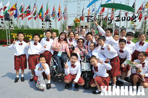 9月4日,合唱团小演员们在北京残奥村里与两名中华台北运动员合影。随着北京残奥会的临近,坐落在奥林匹克公园内的残奥村越来越热闹,运动员、教练员等参会人员在村里互相问候、彼此交流,到处洋溢着喜庆的气氛。新华社记者何俊昌摄