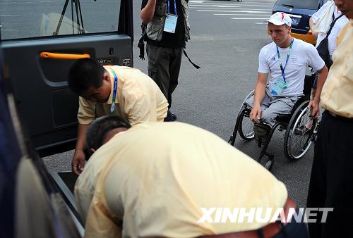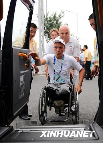 9月4日,一位法国运动员准备乘坐无障碍出租车。北京残奥会为参赛运动员提供了多种无障碍交通服务,不仅在残奥会专用大巴上设有轮椅专用席位,而且还提供了无障碍出租车,方便运动员出行。新华社记者陈凯摄