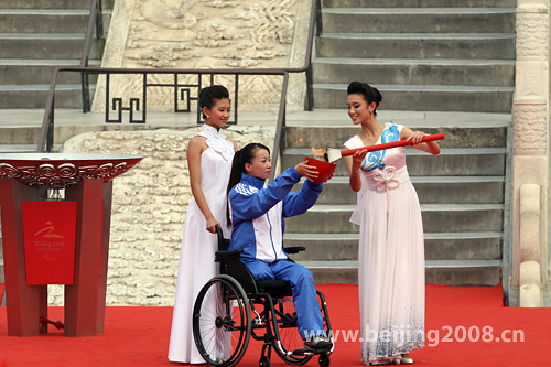 奥运官方网站8月28日讯2008年8月28日上午10点在天坛公园祈年殿举行北京残奥会圣火取火仪式,暨火炬接力启动仪式。图为圣火使者姜馨田点燃金晶手中的圣火盆。(黎晗摄)
