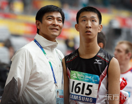 新浪体育讯 2008年9月9日,国家体育场,08残奥会男子100米-T36决赛,中国香港选手苏桦伟获得第3名。刘德华向运动员表示祝贺。 (IC传媒提供) |