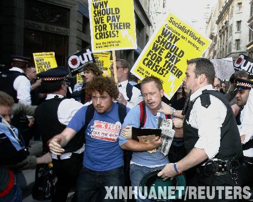 10月10日,在英国首都伦敦,参加反对救市示威游行的一些学生与警察发生冲突。一些伦敦市民和学生当天在伦敦金融街举行反对政府救市示威游行活动,并打出“反对资本家”、“我们为什么要为他们制造的危机埋单”等标语。当日伦敦股市出现大跳水,《金融时报》100种股票平均价格指数跌幅高为8.85%。新华社/路透