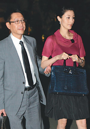李嘉欣(右)提着爱玛仕包,和许晋亨在香港现身,李嘉欣左手上6克拉钻戒亮闪闪。