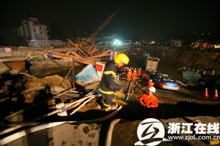 浙江在线前方报道组11月15日21时49分快讯 今天下午,萧山风情大道地铁一号线出口附近发生大面积地面塌陷事故。这是本网记者从现场发回的救援照片。