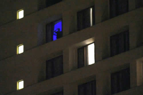 11月27日晚,一名恐怖分子从奥贝罗伊酒店十层的一扇窗户向外张望。