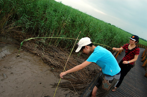 在这里钓螃蟹,钓具就地取材便可。寻找长得细长的芦苇,将杆身上的苇叶拨去,然后把杆顶那唯一片苇叶打个松松的结,就万事具备了。