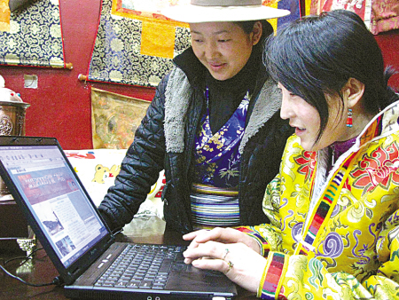 市两会的召开,引起了北仑区新碶街道芝兰社区各民族同胞的关注。图为藏族居民格桑娜姆(右)和曲珍卓玛通过网络了解两会信息。 |