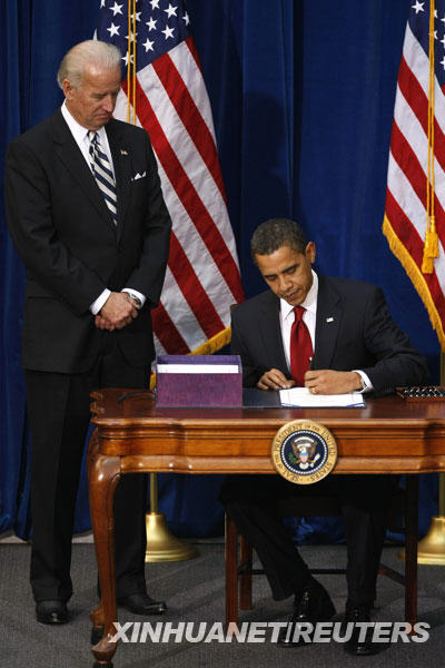 2月17日,在美国西部城市丹佛,美国总统奥巴马(右)签署总额为7870亿美元的经济刺激计划。