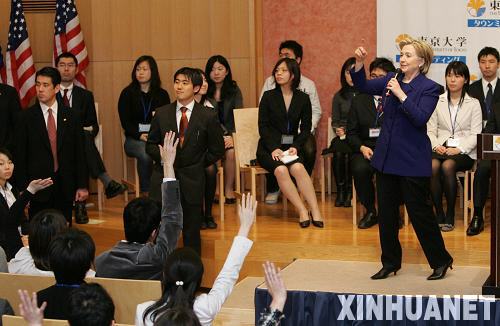 2月17日,在日本东京大学,美国国务卿希拉里(右前)与学生们交流。当日,在日本进行正式访问的美国国务卿希拉里访问了日本著名高等学府东京大学。新华社发