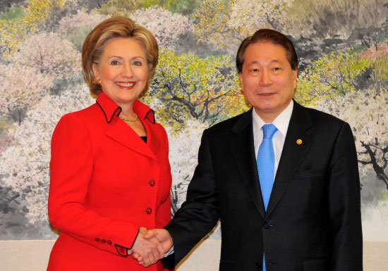 2月20日,在韩国首尔,美国国务卿希拉里(左)与韩外交通商部长官柳明桓握手。新华社/纽西斯通讯社 国际在线消息:韩国外交通商部长官柳明桓和到韩国访问的美国国务卿希拉里·克林顿20日在首尔举行会谈时表示,韩美不能容忍朝鲜拥有核武器,美方同时宣布,美国前驻韩大使斯蒂芬·博斯沃思将担任朝鲜问题特使。 在当天会谈后举行的记者会上,韩美两国外长表示,韩美在任何情况下都不能容忍朝鲜拥有核武器。韩美两国将进行密切合作,通过六方会谈以“完全而可验证的方式”推进朝鲜无核化。韩美敦促朝鲜中断最近的挑衅性行为,无条件地尽快与韩国进行对话。韩美将紧密合作应对朝鲜的有关动向。 希拉里当天宣布,斯蒂芬·博斯沃思将担任朝鲜问题特使,博斯沃思曾于1997年开始任美国驻韩国大使。 在会谈中,双方还表示,韩美将继续深化和发展21世纪面向未来的韩美战略同盟关系。此外,双方还商定将在应对国际金融危机、批准韩美自由贸易协定、阿富汗的稳定和重建等问题上进行合作。