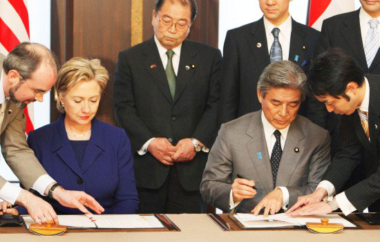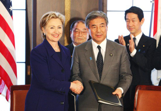 2月17日,在日本首都东京,到访的美国国务卿希拉里与日本外相中曾根弘文共同签署驻冲绳美国海军陆战队迁移至关岛的协定。此协定将加快驻日美军的整编进程。