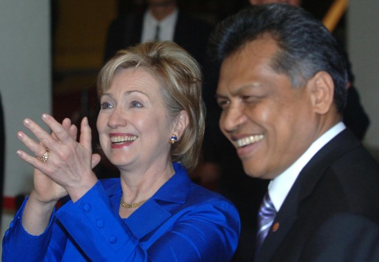 2月18日,在印度尼西亚首都雅加达,到访的美国国务卿希拉里(左)与东南亚国家联盟(东盟)秘书长素林(右)举行会谈前向欢迎者致意。新华社记者岳月伟摄
