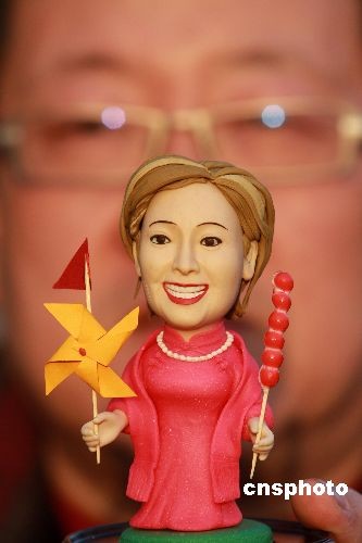2月20日,中国非物质文化遗产项目传承人“面人彭”彭小平展示他精心制作的面人新作品--美国国务卿希拉里。当日,美国新任国务卿希拉里结束访韩行程,开始她亚洲四国之行的最后一站--中国。此次亚洲之行是希拉里出任奥巴马政府国务卿以来首次外交出访,希拉里的访华受到北京市民的关注。中新社发郑雄增摄