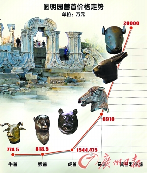 圆明园生肖兽首铜像“身价”一直呈现升势,这次的兔首、鼠首铜像被估称将以2亿元的“天价”拍出。