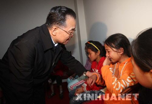 5月13日,温家宝总理在四川绵阳九洲体育馆地震灾民安置点看望灾民。这是温家宝安慰在地震中失去亲人的孩子们。 新华社记者姚大伟摄