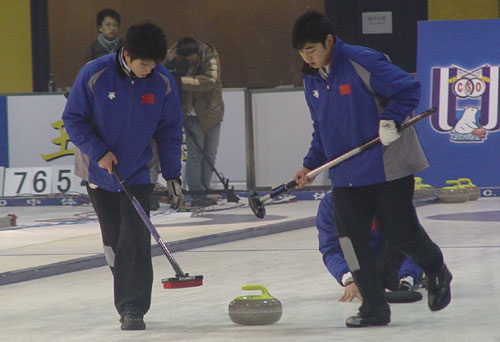 运动员掷壶之后两名队员手持冰刷一直跟随冰壶,时刻准备进行调整。