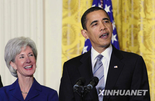3月2日,美国总统奥巴马在白宫提名堪萨斯州州长凯瑟琳·西贝利厄斯(左)为新的卫生部长人选。新华社记者 张岩摄