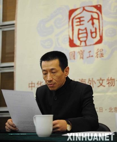 这是委托人蔡铭超,他是中华抢救流失海外文物专项基金的收藏顾问(3月2日摄)。中华抢救流失海外文物专项基金副总干事牛宪峰3月2日在于北京召开的新闻发布会上说,中华抢救流失海外文物专项基金收藏顾问蔡铭超参与了圆明园兔、鼠首在法国巴黎的拍卖,并成为了最后竞拍者。牛宪峰告诉记者:虽然蔡铭超以总计3149万欧元的价格在法国巴黎拍下了圆明园兔、鼠首,但由于尚未付款,且目前仍在付款期限内,因此拍卖能否最终成交尚属未知。新华社记者罗晓光摄