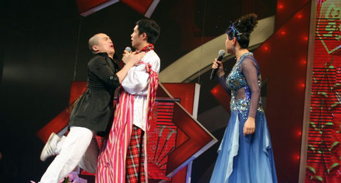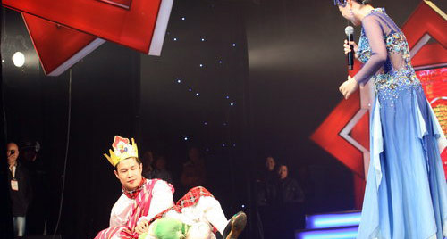 他在台上狂吃香蕉苹果吃相搞笑惹得观众爆笑连连。演出中途,一个身穿黑衣白裤的女粉丝冲上舞台强亲小沈阳,观众被这突如其来的阵势吓呆了,突然“她”的假发套脱落,观众立即辨认出“她”原来是男扮女装的小沈阳同门师兄弟小龙。