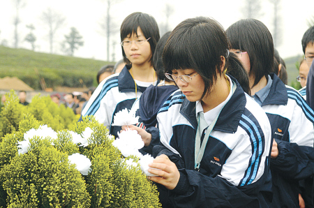 3月22日,学生为徐校长献上自己亲手扎的小白花。(陈斌荣 摄)