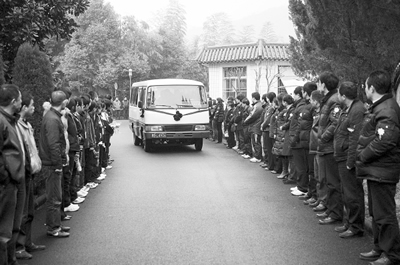 3月2日,去殡仪馆的路上,上千群众列队为“阿科”送行。 (陈斌荣摄)