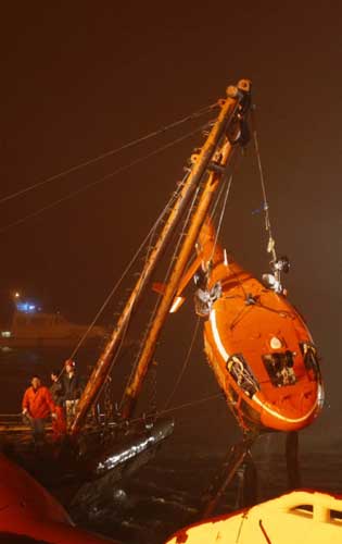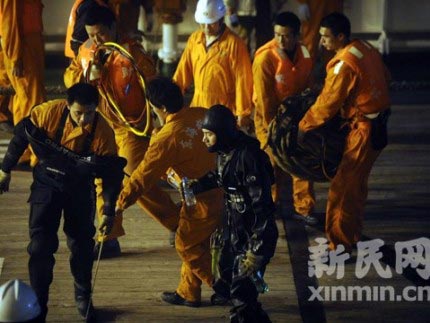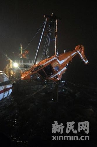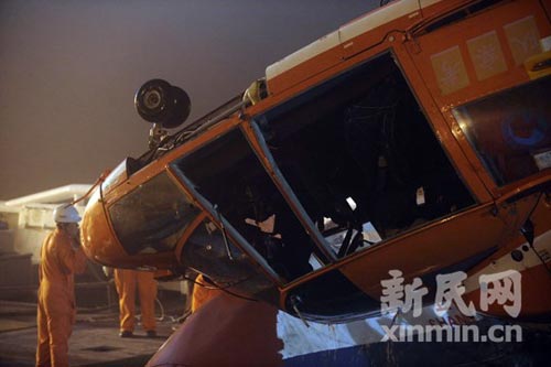 东方网记者在现场了解到,晚上22点40分,两艘吊船根据此前确定的失事直升机在海底的位置,来到打捞现场,其中一艘停在救援船的右后侧协助打捞工作,另外一艘停在一旁待命。22点48分,现场下起了小雨,5名救援人员陆续下水,用钢索固定住失事的直升机,并用吊船起吊。22点58分,失事直升机被吊出水面。23点01分,失事直升机被放置到甲板上。