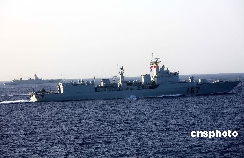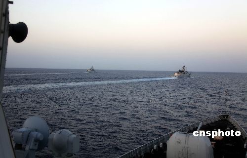 亚丁湾当地时间4月17日傍晚,中国海军首批护航编队“武汉”号、“海口”号导弹驱逐舰,在亚丁湾海域告别第二批编队的“深圳”号导弹驱逐舰(前左),准备启程回国。中新社发 孙自法 摄