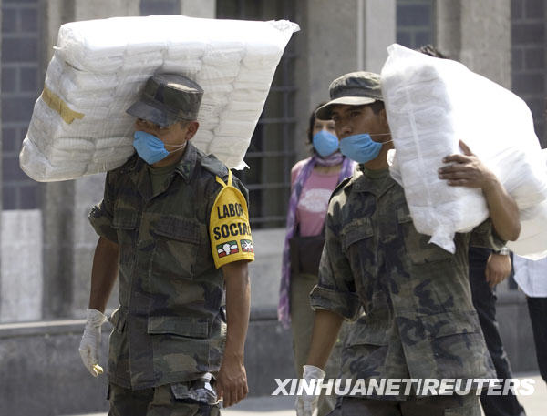 4月25日,在墨西哥首都墨西哥城,两名士兵搬运待分发给行人的口罩行走在大街上。 美国动态:患者增至11人建紧急行动中心 美国纽约市圣·弗朗西斯初等中学大批学生出现流感症状,医疗部门紧急对学生患者进行检查。学校已于24日晚间关闭。报道说,这所学校的75名学生23日出现流感症状,24日更多学生患上流感。学校因此紧急取消24日的晚间课程。 眼下纽约防疫和卫生部门正在对学生患流感的病毒种类进行检测。学校负责人表示,现阶段尚不能确认导致这些学生患病的是否就是猪流感病毒,“也有可能就是常规的人流感B型病毒。” 美国疾病控制和预防中心代理主任理查德·贝塞尔24日说,加利福尼亚州本月21日以来发现的猪流感病毒感染者已增至8人,他们全部是在加利福尼亚州和得克萨斯州,但均已治愈。贝塞尔当天对媒体说,这些感染者都已康复,他们感染的病毒比较“温和”,康复前只有一人需要住院治疗。 美国政府官员当天也对媒体说,白宫正密切关注此事,美国已建立紧急行动中心,对感染者及相关人员展开调查,寻找感染源。美国卫生局官员已经向游客发出疫情通知,提醒游客注意卫生、勤洗手。但是暂时没有劝谕国民不要前往墨西哥。墨西哥政府也认为,眼下没有必要关闭边境。详细 美国猪流感患者增至11人世卫称美墨疫情构成紧急事态 美国堪萨斯州卫生部门官员25日确认,该州一对夫妇感染了猪流感,加利福尼亚州当天也新发现一名猪流感患者,这使得美国猪流感患者总数达到11人。世界卫生组织当天发表声明说,美国和墨西哥发生的猪流感疫情已构成“具有国际影响的公共卫生紧急事态”,所有国家都应加强对非正常暴发的流感类疾病和严重肺炎的监控。 美国堪萨斯州卫生和环境部官员贾森·埃伯哈特-菲利普当天表示,染病夫妇生活在该州中部的迪金森县,两人病情较轻,无需住院,他们已经自愿将自己隔离。 纽约70多名学生在墨西哥度假后感染"疑似猪流感" 墨西哥发生的猪流感疫情目前可能正在向北部的美国扩散。其中,纽约皇后区一所中学25日有75名学生在从墨西哥度假归来后,集体出现流感症状,有关方面正在加紧调查他们是否染上“猪流感”。此前,加州确诊了一名感染猪流感病毒的儿童。