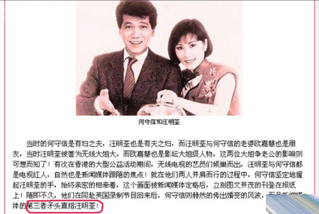 当时的何守信是有妇之夫,汪明荃也是有夫之妇,而汪明荃与何守信的老婆欧嘉慧也是朋友,当时汪明荃被誉为无线大姐大,而欧嘉慧也是影坛大姐级人物,这两位大姐争老公的影响则可想而知了!有次在香港的大型公益活动期间,无线电视的艺员们倾巢而出,汪明荃与何守信都是电视红人,自然也是新闻媒体跟随的焦点!就在他们两人并肩而行的过程中,何守信坚定地握起汪明荃的手,始终亲密的相牵着,这个画面被新闻媒体定格后,立刻图文并茂的刊登在报纸上!随即不久,他们在同赴英国录制节目回来后,何守信则赫然的传出婚变的风波,而且新闻媒体的第三者矛头直指汪明荃! 本篇新闻热门关键词:报纸 |