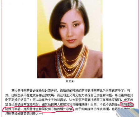 其次是汪明荃曾经在拍戏时流产,造成的遗留问题导致汪明荃此后很难再怀孕。汪明荃决不愿意放弃事业的发展,又无能力确保自己的生育问题,所以最终也只剩下离婚的结局了! 另外,不能不提的是汪明荃在结婚几年后,跟香港金牌司仪何守信的婚外恋情,也成为加速汪明荃婚姻破碎的因素之一。 |