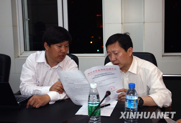 5月10日,从北京来的防疫专家(右)与当地卫生厅官员研究方案。