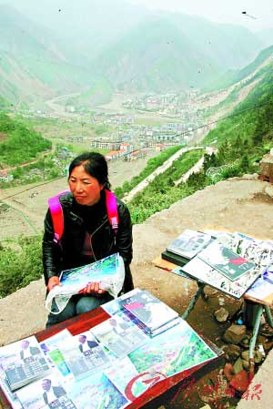 在北川老城区,一名当地居民摆卖书籍和VCD等地震纪念品。