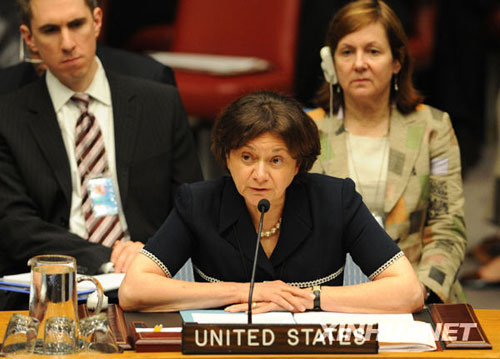 6月12日,美国常驻联合国副代表Rosemary DiCarlo在联合国安理会发言。当日,联合国安理会一致通过第1874号决议,对朝鲜5月25日进行核试验表示“最严厉的谴责”,并要求朝鲜今后不再进行核试验或使用弹道导弹技术进行任何发射。新华社记者申宏摄