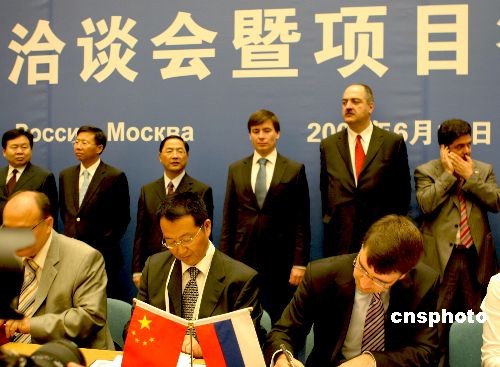 中国商务部副部长蒋耀平与俄经济发展部副部长斯列普涅夫共同出席了中俄经贸论坛,并共同参加了随后举行的签约仪式。
