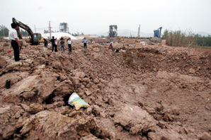 6月21日,安徽省凤阳晶鑫矿业有限公司院内被炸出一个直径约10米、深约5米的巨大深坑。新华社发 (高微 摄)