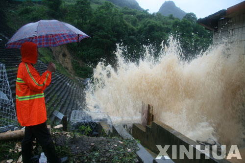 7月3日下午6时,一位监测人员在广西罗城卡马水库旁查看大坝安全情况。