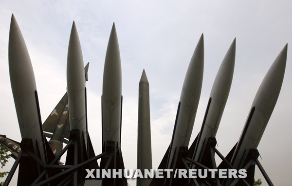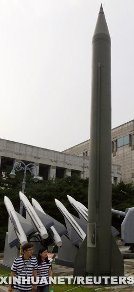 韩国联合通讯社7月4日报道,朝鲜当地时间14时50分(北京时间13时50分)在东海岸元山地区向海上发射了当天第五枚导弹。图中后方中间为在韩国首都首尔展示的飞毛腿导弹模型(摄于2009年7月4日)。新华社/路透