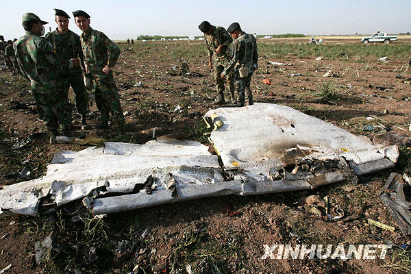 7月15日,在伊朗加兹温市附近的坠机现场,几名士兵站在坠毁客机的残骸旁。当日,伊朗里海航空公司的一架客机在该国西北部城市加兹温附近的村庄坠毁,机上153名乘客和15名机组人员全部遇难。新华社记者梁有昶摄