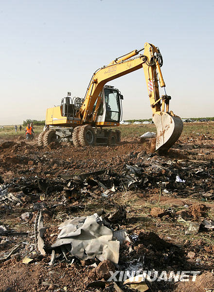 7月15日,在伊朗加兹温市附近的一个村庄,一台挖土机在清理坠机现场。当日,伊朗里海航空公司的一架客机在该国西北部城市加兹温附近的村庄坠毁,机上153名乘客和15名机组人员全部遇难。新华社记者梁有昶摄