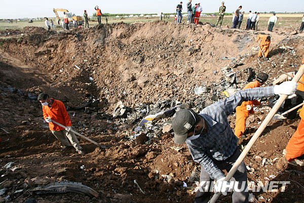 7月15日,在伊朗加兹温市附近的一个村庄,飞机坠落后在地面形成一个大坑。当日,伊朗里海航空公司的一架客机在该国西北部城市加兹温附近的村庄坠毁,机上153名乘客和15名机组人员全部遇难。新华社记者梁有昶摄 |
