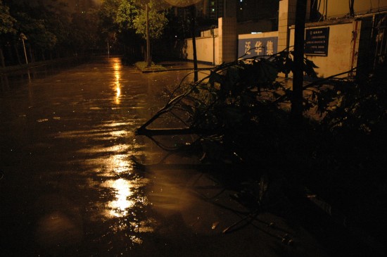 7月19日凌晨4点半左右在深圳市区拍摄的道路两旁被狂风折断的树木。