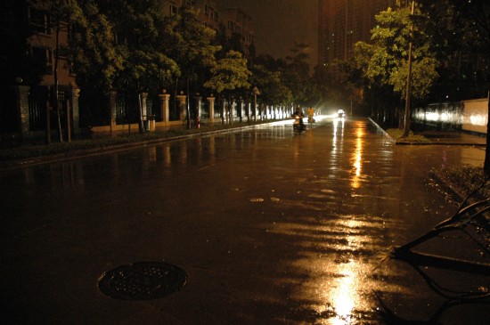 7月19日凌晨4点半左右在深圳市区拍摄的景象,雨势有所减缓,但风势依然强劲。