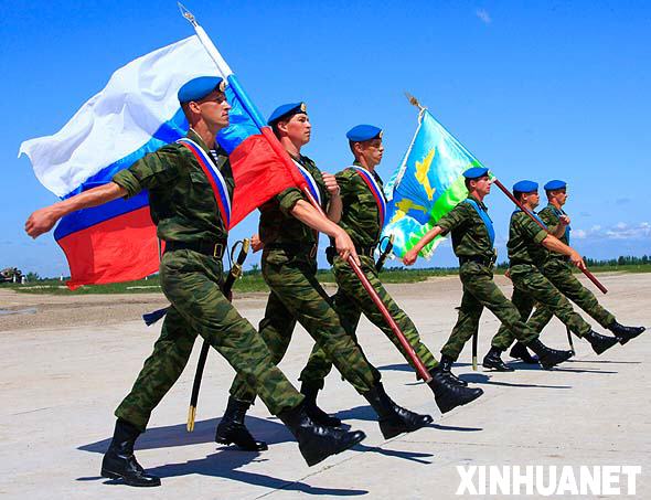7月22日,俄方空降兵仪仗兵在进行训练。新华社记者 查春明 摄