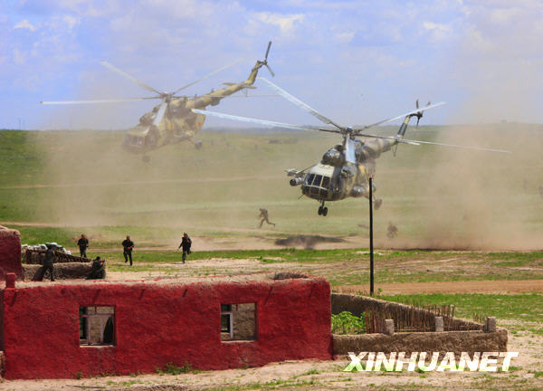 7月21日,俄方特种兵乘直升机进行机降。