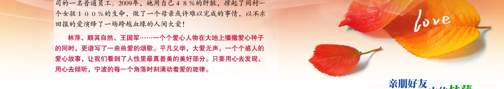 摘要:4月初,与林萍同村的8岁女孩徐洁被查出患上了一种叫肝痘核变性的病。林萍从婆婆处得知消息后,第二天和丈夫一起到宁波市妇儿医院看望徐洁。躺在病床上原本聪明可爱的徐洁,这时肚子隆起,双脚浮肿。林萍看了有种说不出的难受:一朵尚未开放的花朵,难道就这样枯萎了…… |