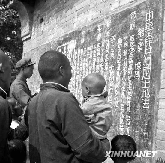 这是河南省洛阳专区偃师县的农民在阅读《中华人民共和国土地改革法》。新华社发(资料照片)